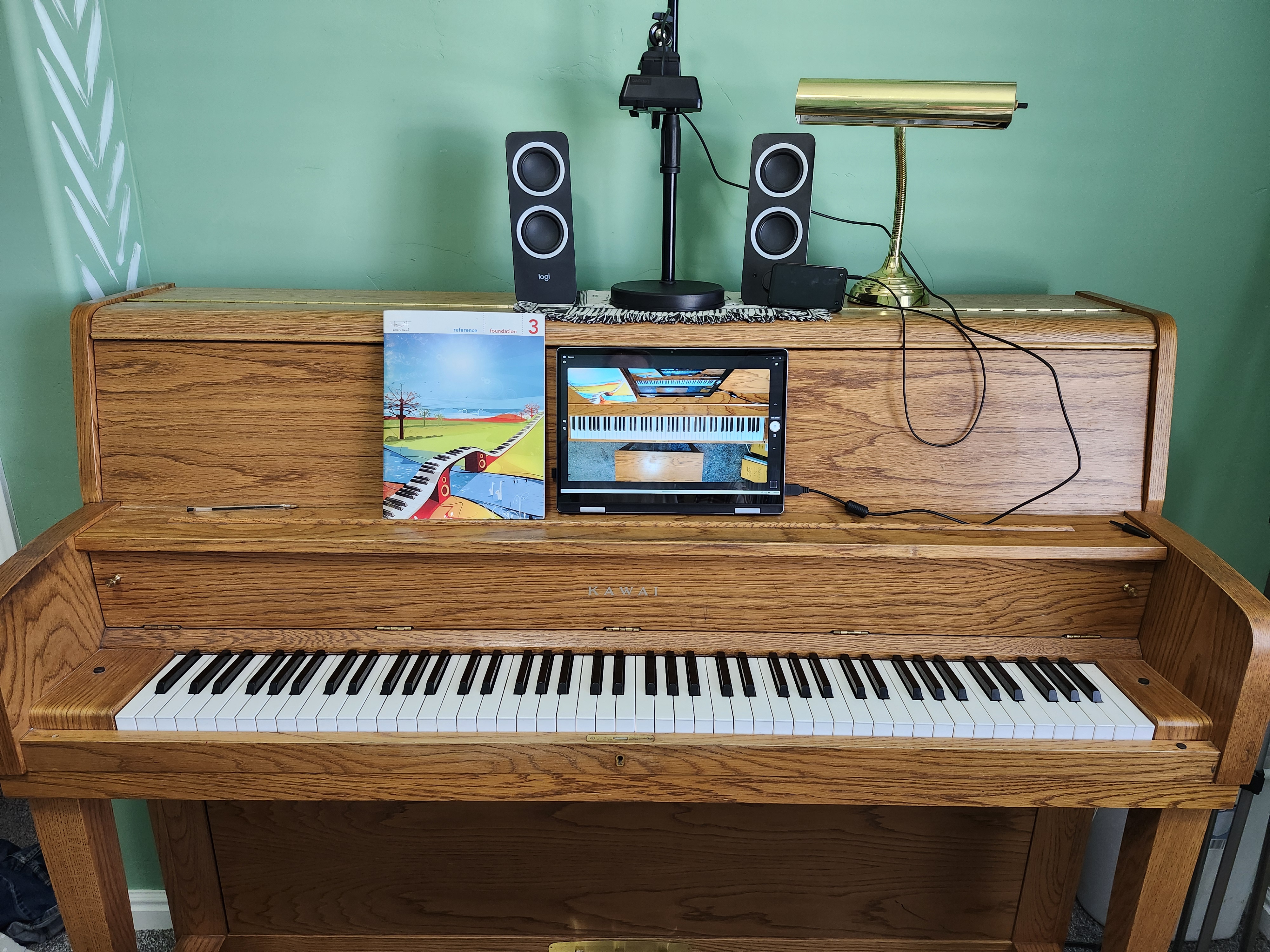 Install Zoom on all devices. In Zoom, under audio settings "Original sound for musicians" needs to be selected on the large screen device. If using a phone for the above keyboard camera, the microphone needs to be muted in Zoom and the speaker volume turned all the way down to avoid feedback.