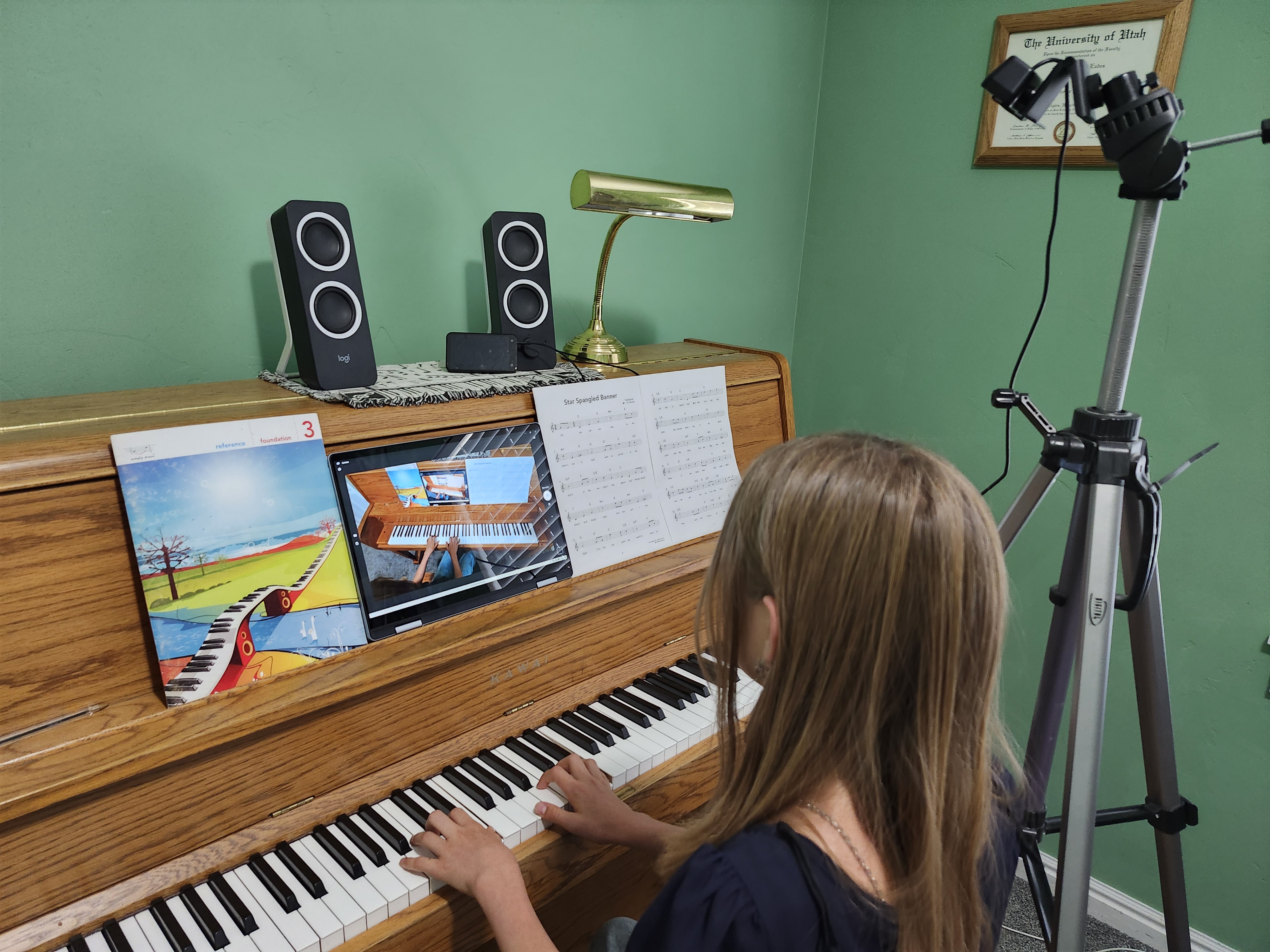 A tablet or laptop (if it folds backwards) works well. It allows a student to see the instructor at all times and allows the instructor to see student's face. A music stand or a tall stool is a good spot for a laptop if that is needed or preferred.